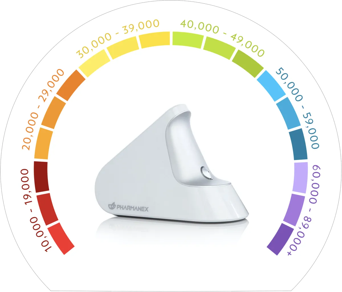 The Pharmanex® BioPhotonic Scanner is a cutting-edge, non-invasive device that measures the levels of carotenoid antioxidants in your skin using a technology called Raman Spectroscopy. It works by emitting a low-energy blue light onto the palm of your hand, which interacts with the carotenoid molecules in your skin, causing them to reflect a specific wavelength of light. This reflection is then measured to generate an antioxidant score, providing a real-time, objective view of your nutritional status. No blood draw or lab work is needed.